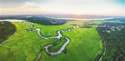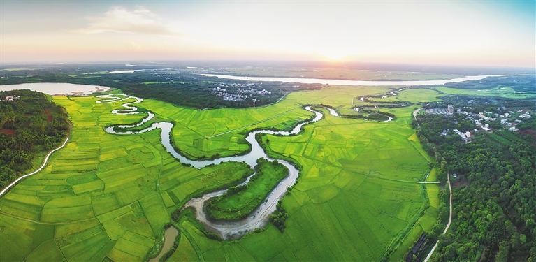 大自然的鬼斧神工,将全长28公里的这条南渡江支流压缩成了三十六个弯曲的河道,形成蜿蜒曲折的三十六曲溪。从高空俯视,溪流犹如一条灵动的丝带,轻柔地飘落在肥沃的平原上。目前,琼山区正在三十六曲溪建设省级湿地公园,通过生态文明建设保护这里珍贵的自然资源。