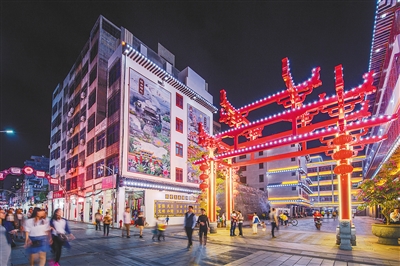 福地美食街是“琼台复兴”中的一大亮点,这条美食街的前身是培龙市场。经过数月的“修旧如旧”改造,街道变得整齐划一、整洁舒适。傍晚时分,行走在美食街上,古城牌坊、琉璃青砖与淡黄色的灯光交相辉映,文化与美食在这里交融。福地美食街如今成了琼山百姓休闲娱乐的汇聚地之一。