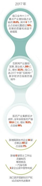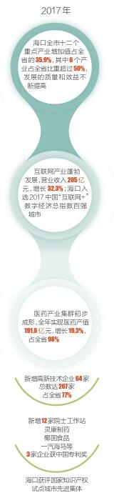 2017年,海口全市十二个重点产业增加值占全省的35.9%,其中6个产业占全省比重超过50%。海口的产业结构升级明显,产业发展潜力和经济实力大大增强。