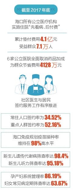 截至2017年底,海口所有公立医疗机构实施住院“先看病、后付费”,累计垫付费用4.1亿元、受益群众7.1万人;6家公立医院全面取消药品加成,为群众节省费用4128万元。