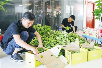 10月16日,在陵水黎族自治县本号镇电子商务精准扶贫服务中心,工作人员正忙着整理、装箱贫困户种植的香粉蕉,准备发货。