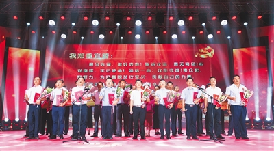 “我郑重宣誓:勇当先锋,做好表率!脱贫攻坚,责无旁贷!听党指挥,牢记使命!团结一心,攻坚克难!集众智,聚群力,为打赢脱贫攻坚战,贡献自己的力量!为推进自贸区自贸港建设,扛起陵水担当!”晚会最后进入宣誓环节,获奖代表与全场观众一起对着党徽宣誓,铮铮誓言响彻耳畔,一字一句都是担当!