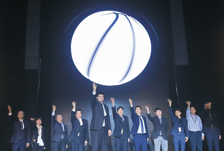 10月18日,2018-2019中国男子篮球职业联赛(CBA联赛)新闻发布会在京举行。中国篮协主席、CBA公司董事长姚明宣布新赛季将于10月21日打响。图为姚明(中)与嘉宾一起用托举篮球姿势启动新赛季。 新华社发