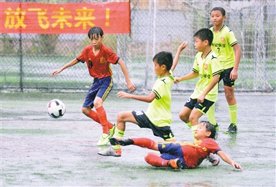 10月21日,“友邦中国青少年足球发展项目”海南省足球联赛在琼海举行比赛。本次联赛有8所乡村学校球队参加,冠亚军球队将于11月代表海南到上海参加四省联赛。图为小将们在雨中比赛。特约记者 蒙钟德 摄