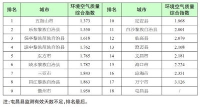 按照城市环境空气质量综合指数(以二氧化硫、二氧化氮、可吸入颗粒物、细颗粒物、臭氧、一氧化碳6项指标进行计算)评价,2018年9月,空气质量排名靠前的分别是五指山、乐东和保亭,排名靠后的分别是琼海和万宁,屯昌监测有效天数不足排名最后。2018年9月全省18个市县(三沙市除外)城市(镇)环境空气质量排名如下: