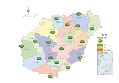 全省环境空气质量总体优良,优良天数比例为99.8%,其中优占92.7%、良占7.1%,轻度污染占0.2%,无中度污染、重度和严重污染天。临高县、文昌市受臭氧影响,分别出现1天、2天轻度污染,优良天数比例分别为98.9%、97.7%;其余市县优良天数比例均为100%。与去年同期比较,全省空气质量优良天数比例下降0.2个百分点。