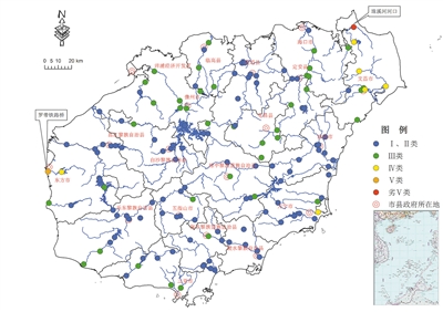 全省地表水环境质量总体为优,水质总体优良率为94.4%。开展监测的52条河流110个断面中,94.6%的监测断面水质符合或优于地表水Ⅲ类标准。其中,Ⅰ类水质断面占1.8%,Ⅱ类占65.5%,Ⅲ类占27.3%,Ⅳ类占3.6%,Ⅴ类占0.9%,劣Ⅴ类占0.9%。Ⅳ类水质出现在万宁市东山河后山村、文昌市文昌河水涯新区、文教河潭牛公路桥、坡柳水闸等4个断面,Ⅴ类水质出现在东方市罗带河罗带铁路桥断面,劣Ⅴ类水质出现在文昌市珠溪河河口断面。开展监测的23座湖库中, 21座湖库水质符合或优于地表水Ⅲ类标准。其中,戈枕水库、石碌水库等2座水库水质符合Ⅰ类,松涛水库、赤田水库等10座水库水质符合Ⅱ类,大广坝水库、大隆水库等9座水库水质符合Ⅲ类,高坡岭水库和湖山水库2座湖库水质为Ⅳ类。