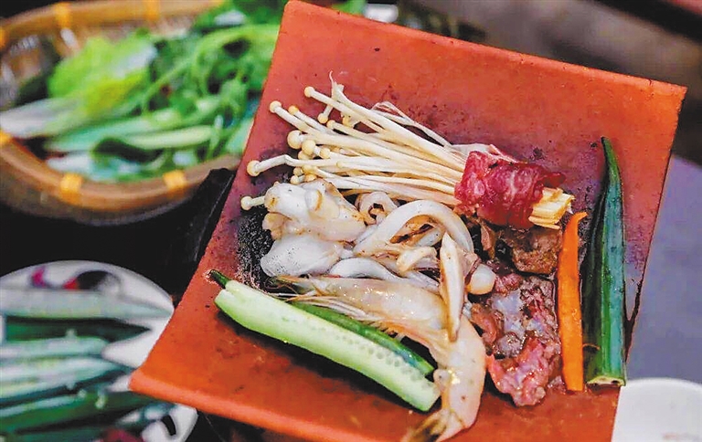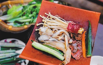 进入烧烤环节,一个特制的烤炉煨着热烈的炭火,崭新的瓦片放在炉上。烤炉和瓦片均是用红泥烧制而成,红泥在燃烧时能均匀地传递热能,且以瓦片作为中介,烧烤时食物不直接和火炭接触,不会吸附上炭灰,吃起来更健康。