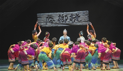 翠绿“田野”间,演员们活泼地抛出斗笠,牧童、水牛,一幅优美的田间美景展开在观众面前,苏东坡扮演者孙科在田野间“起舞”,与“黎族人民”畅享田间野趣,伴随着节奏明快的配乐,观众从舞台上不仅感受到了海南人民的热情淳朴,也领略到了海南岛美丽的自然风光。桄榔林中起新居,天涯学堂里教百姓,苦心凿开“东坡井”,北岸码头惜别离……90分钟的舞剧,以丰富场景呈现苏东坡的海南经历,向观众传递了苏东坡“他年谁作舆地志,海南万里真吾乡”的情意。