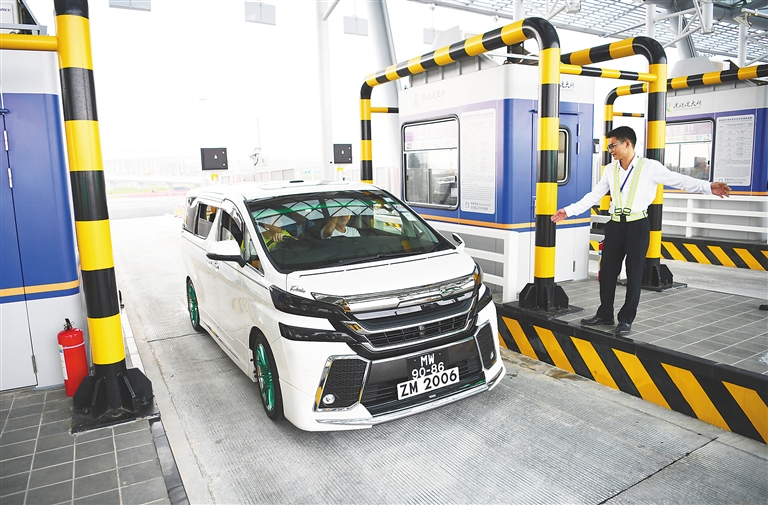 上午9时整,澳门口岸离境车道闸口开杆放行,首辆私家车驶过关口。同时,边检大楼也向排队的旅客敞开大门,旅客们有序进入旅检大厅通关。港珠澳大桥澳门口岸正式通车运营,港珠澳大桥飞架东西、横越伶仃洋,澳门无陆路直通香港的历史至此宣告结束。