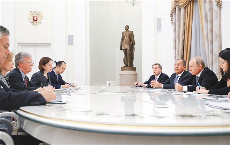 访问期间,博尔顿与俄总统普京以及联邦安全会议秘书帕特鲁舍夫、外长拉夫罗夫、防长绍伊古举行了会谈。博尔顿向俄方详细阐述了美方考虑退出《中导条约》的理由,称俄方违反了条约规定。