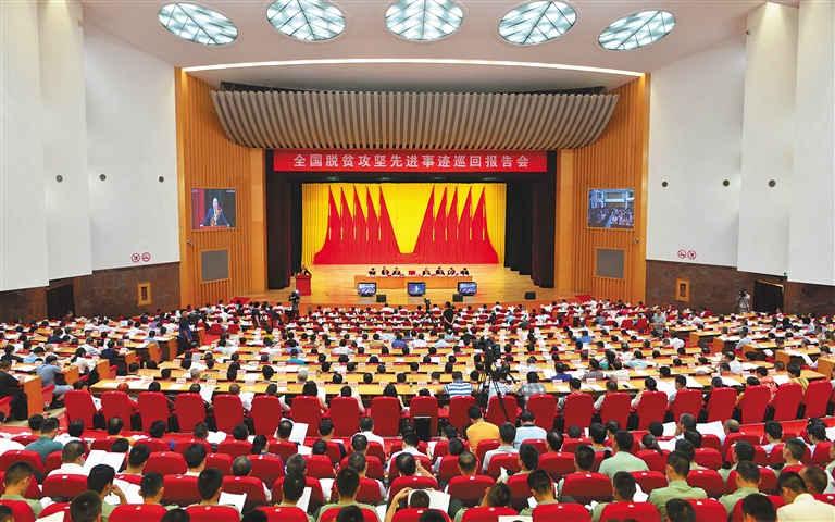 中国扶贫基金会副会长、广东省对外文化交流中心理事长陈开枝,22年间105次深入广西壮族自治区百色贫困山区扶贫济困,为东西部扶贫协作作出巨大贡献;四川省达州市渠县扶贫和移民工作局局长、县政府办公室副主任张渠伟,因长年超负荷工作患上重疾,但他不惧危险,昼夜战斗在攻坚一线,调研提出20余种攻坚方法,破解督导、推进、监管等三大难题;国务院扶贫办粤桂两省区贫困村创业致富带头人培训基地主任、广西澳益农业发展有限公司董事长潘健章,带动贫困户融入产业化链条,促进长期稳定增收,全县6000多户贫困户参与特色产业项目,5000多户实现增收脱贫;山西省吕梁市林业局局长郝金光讲述了该局因地制宜,大胆创新,同时打响脱贫攻坚、生态治理“两个攻坚战”,生动实践“绿水青山就是金山银山”,带动3.6万人稳定脱贫;河南省周口市沈丘县冯营乡李寨村党支部书记李士强,弃商返乡,带领党员群众用滚石上山的精神和干劲脱贫攻坚,全村人均纯收入增加了近4倍,120户432人实现了稳定脱贫;西藏自治区日喀则市上海实验学校校长、上海师范大学基础教育发展中心常务副主任傅欣,通过“组团式”帮扶,使学校办学水平、教学成绩得到跨越式提升,极大促进了日喀则地区教育现代化进程。