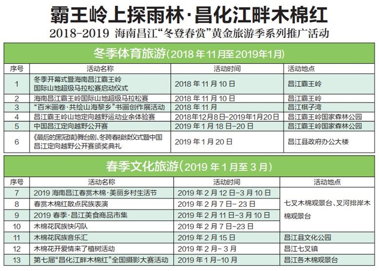 近年来,昌江充分挖掘景区景点文化底蕴,实施文化旅游品牌战略,通过一年四季不同的旅游主题,推出了“春赏木棉红、夏品芒果香、秋游棋子湾、冬登霸王岭”的全域全季旅游活动,努力把昌江打造为全省全域全季旅游示范县。