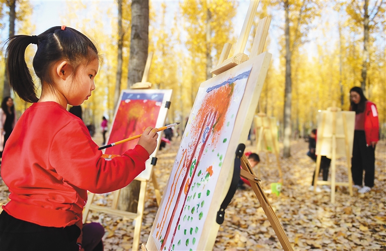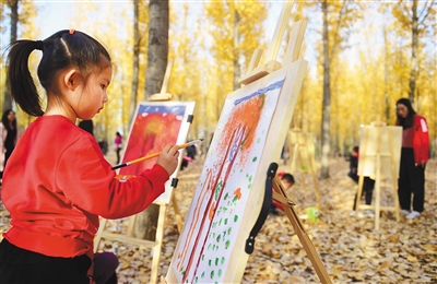 10月25日,河北沧州职教中心幼儿园的孩子来到大运河森林生态园内赏秋写生,用手中的画笔留住自然美景。 新华社发(傅新春 摄)