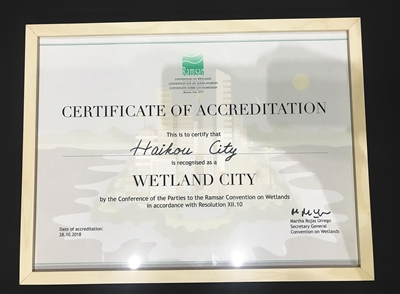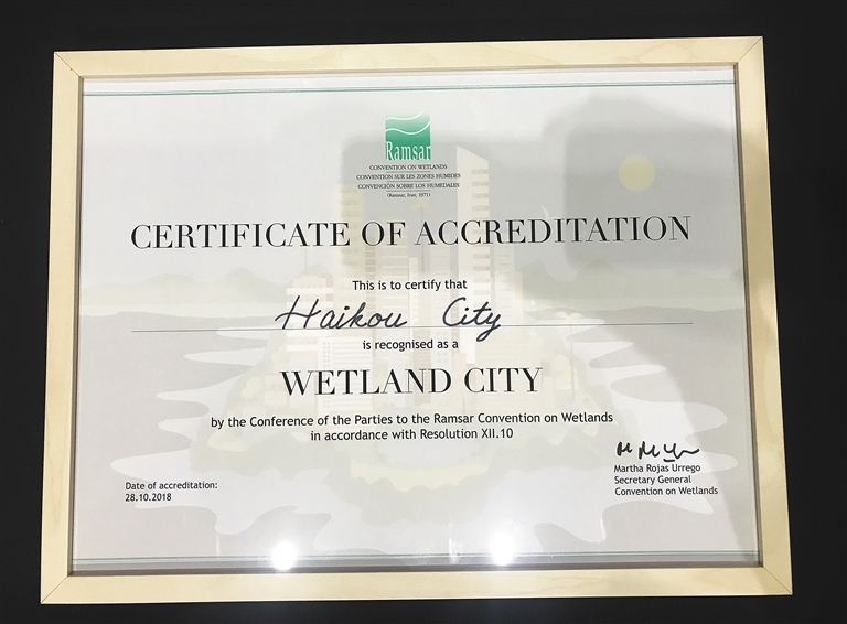 迪拜当地时间10月25日13时,海口荣获“国际湿地城市”称号。15时,在《关于特别是作为水禽栖息地的国际重要湿地公约》(以下简称《国际湿地公约》)第十三届缔约方大会湿地城市授牌仪式上,海口市代表团团长、海口市副市长文斌上台领牌。来自全球170多个国家和地区的1700多名政府和非政府组织代表见证了这一光荣时刻。