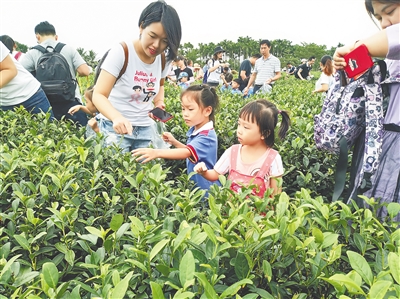 在茶工的组织下,家长和小朋友背着小茶篓,穿梭在错落有致的茶园里。茶园还举行以家庭为组合的采茶比赛,一阵阵欢声笑语持久不息。采茶归来,在现代化的茶叶加工车间,小朋友们了解茶叶的加工制作等。