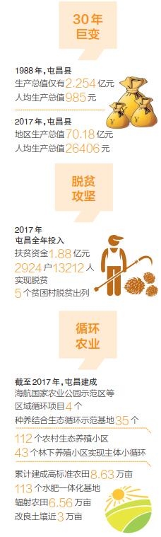 1988年4月,海南建省办经济特区,30年来,屯昌与海南经济特区共同成长。1988年,屯昌地区生产总值仅有2.254亿元,人均生产总值985元。2017年,屯昌县实现地区生产总值70.18亿元,人均生产总值26406元。
