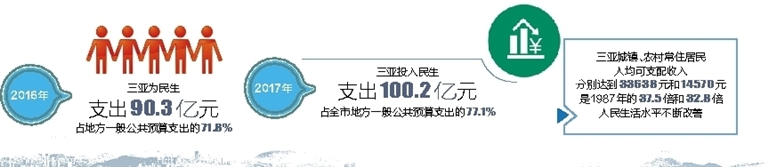 2015年,三亚为民生支出89.9亿元,增长18.4%;2016年,三亚为民生支出90.3亿元,占地方一般公共预算支出的71.8%;2017年,三亚投入民生支出100.2亿元,占全市地方一般公共预算支出的77.1%。一年更比一年厚的民生账本,体现出三亚浓浓的民生关怀,多项民生改革的成果惠及三亚市民,不断提升了人民群众的幸福指数。