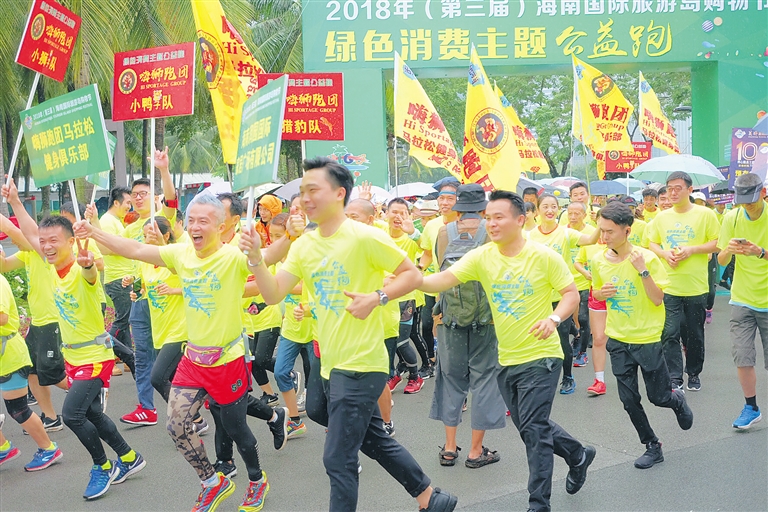 10月20日上午,由海南省商务厅主办的海购节绿色消费主题公益跑暨陵水格择村农产品消费扶贫活动在海口万绿园举行。活动吸引了近600人报名参加,参与者身着绿色T恤,以跑步这一形式,身体力行向社会传递健康的生活方式以及倡导绿色消费的理念。