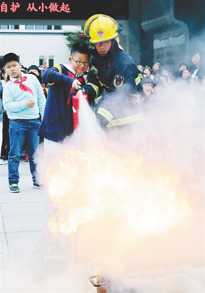 11月6日,苏州市金阊实验小学的学生在消防员指导下学习使用灭火器。