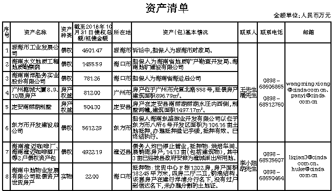 本公告有效期为22天,受理征询或异议有效期为22天,如对本次处置有任何疑问或异议请与相关人员联系。本公司地址:海口市滨海大道123-8号信恒大厦17-18层。对排斥、阻挠征询或异议的举报电话:0898-68623068。对排斥、阻挠征询或异议的举报电子邮件:huangzimin@cinda.com.cn。特别提示:以上资产信息仅供参考,信达公司不对其承担任何法律责任。以上资产的有关情况请查阅我公司网站,网址:www.cinda.com.cn.