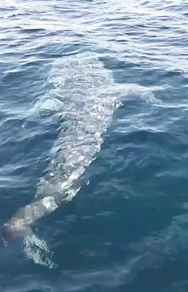 据目击者称,这条鲸鲨大约10米长,身上散布淡色斑点。据悉,鲸鲨身体庞大,最大个体体长达20米,体重能达30多吨,被称为“最大的鲨”。其主要分布于热带和温带海区,以小鱼小虾及浮游生物为食。