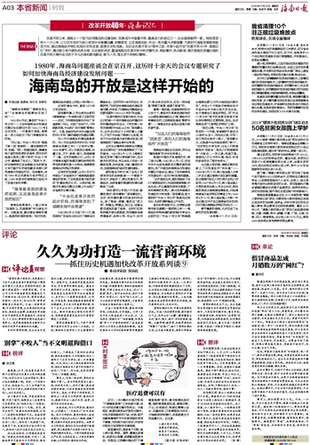 改革开放以来,海南从一个较为封闭落后的边陲岛屿,发展成为中国最开放、最具活力的地区之一,社会面貌焕然一新。特别是党的十八大以来,以习近平同志为核心的党中央高瞻远瞩、统筹谋划,立足海南实际,作出一系列重大决策部署,为新时代海南发展指明前进方向,推动海南经济特区实现历史性变革,取得历史性成就。在纪念改革开放40周年之际,本报今起开设“改革开放40年·海南记忆”专栏,通过部分有代表性的亲历者、见证者的讲述,重温海南在改革开放中的关键节点、典型事件、热点新闻,展示海南在波澜壮阔的改革开放大潮中走过的不平凡历程和敢闯敢试、敢为人先、埋头苦干的特区精神。