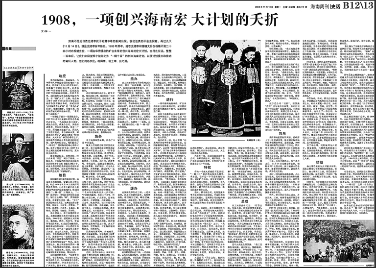又如, 2008年11月10日钟业昌发表的《1908,一项创兴海南宏大计划的夭折》,以光绪帝去世100年为一个时间节点,回望一项由华侨提出的旷古未有但最终付之东流的创兴海南的宏大计划。