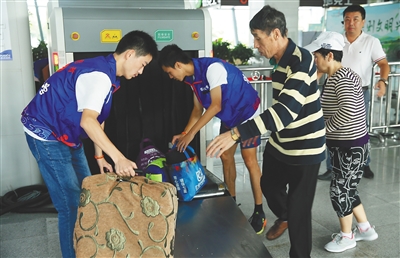 海南日报记者在海口汽车客运总站看到,从乘客进站到出站,都能看到360°暖心服务队大学生志愿者的身影。他们为乘客们搬运沉重的行李,帮助老年乘客使用自动售票机购票。