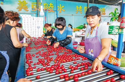 11月27日,在陵水黎族自治县光坡镇武山村圣女果收购点,工人们正忙着给新鲜采摘的圣女果清洗、分拣、称重、装箱打包。