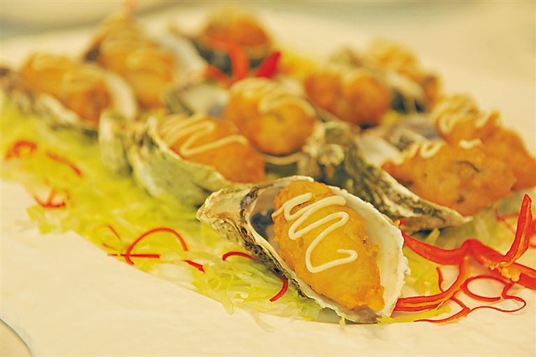 比如,生蚝口感嫩滑,如何将这一特点发挥到极致?传统烹饪中,常用蒜蓉、葱花、蚝油给生蚝调味,隔水蒸或是炭火烤,将蒜味与生蚝鲜味完美融合。而有厨师则尽情发挥想象力,将新鲜生蚝从外壳中取出,蚝肉外裹葱花、面粉,放入中温油锅中慢炸,待外皮松软酥脆后出锅,依次摆在生蚝壳中,装点餐盘后即大功告成。这样的做法,外皮香脆,蚝肉鲜美,既保留了生蚝嫩滑的特点,酥脆的炸面皮也让口感层次更加丰富。