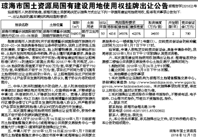 琼海市国土资源局国有建设用地使用权挂牌出让公告