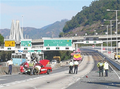 11月30日凌晨,香港青衣长青公路发生严重车祸,导致5人死亡,30多人受伤。目前所有伤者已被分别送到附近4家医院,救援正在进行当中。 新华社记者 吴晓初 摄