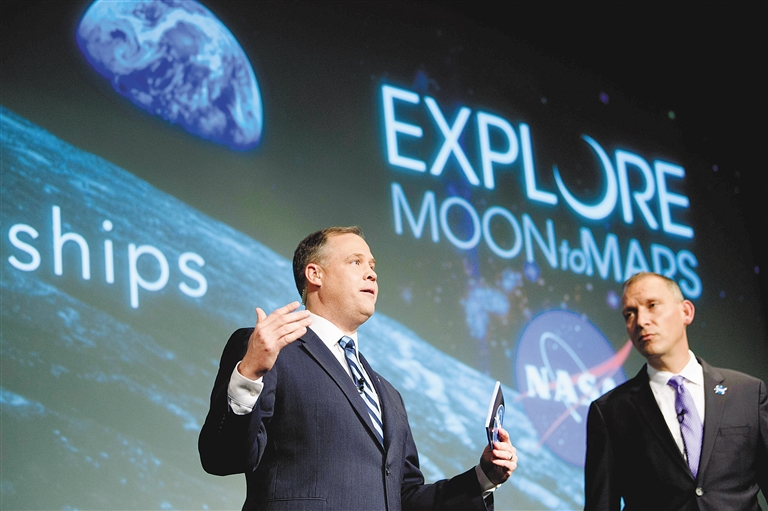 11月29日,在美国华盛顿,美国航天局局长吉姆·布里登斯廷(左)在一场活动上讲话。