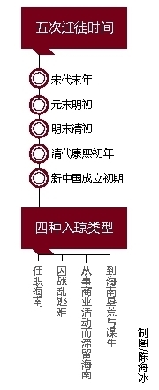福建人向海南迁徙,大体可分四种类型的人群:因任职而落籍群体,因躲避战乱而入琼的群体,福建垦荒为谋生的群体,游学海南而后滞留下来的群体。