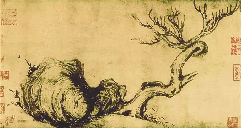 一株枯木状如鹿角,虬屈的姿态有如扭曲挣扎而生的身躯,显示出了无穷的活力,气势雄强。树脚左侧一块怪石盘踞,被风雨侵袭的条条纹路、残缺的边角印证着时间的沧桑,给人尖峻硬实的感觉。盘旋如涡的石皴,好像在飞快旋转,构成画面的运动感,显现出怪石顽强的生命力。石头后面的几支焦墨竹叶以及树下的几丛青草作为点缀,又给人无限希望,传达出画家执拗而旷达的内心。这是《枯木怪石图》画面的基本情况。尽管并不是所有人都完全认同这幅画的原作者是苏轼,但是苏轼偏好“枯木怪石”却是不争的事实。对“枯木怪石”的偏好,正好彰显了苏轼这一“不可救药的文人”的真性情。