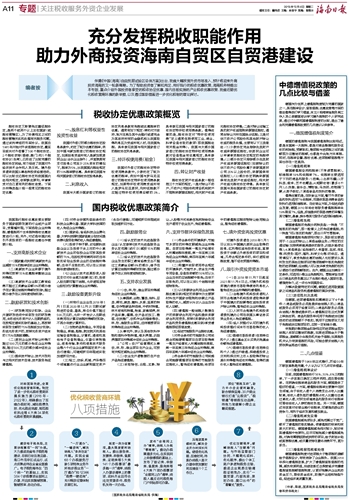伴随《中国(海南)自由贸易试验区总体方案》出台,我省大幅放宽外资市场准入,预计将迎来外商投资海南的又一轮新高潮。为了帮助投资者了解和用足、用好现行的税收优惠政策,海南税务特推出本专版,重点介绍外国投资者享受的税收协定优惠、国内目前实施的产业税收优惠政策、我省近期优化税收营商环境的新举措,以及通过国际借鉴进一步优化税制的理论探讨。