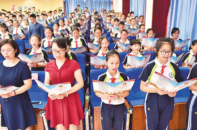 在教育部统一部署下,4日一早,我省各大中小学校就动员组织学生通过教育部全国青少年普法网集中收看了教育部“宪法晨读”活动的网络直播并同步跟读。无法组织学生同步集中观看的学校也自行组织了升旗仪式和宪法晨读活动。