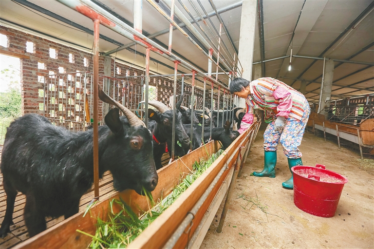 “咩……”12月5日,文昌公坡连榜养殖黑山羊农民专业合作社的羊栏里传出小羊崽的叫声。贫困户黄爱玲将粉碎后的牧草熟练地投进食槽。该合作社已有28户贫困户入股。今年以来,文昌大力推行“五带动全覆盖”产业扶贫模式,鼓励和引导贫困村民与农业龙头企业、共享农庄、农民合作社示范社、示范家庭农场、致富能人等5类经营主体建立利益联结机制,通过发展特色扶贫产业,实现脱贫致富。截至目前,已有1.6万余名贫困村民与5类经营主体建立利益联结机制,踏上脱贫路。本报记者 袁琛 摄