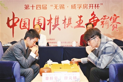 12月5日,在无锡市举行的第十四届中国围棋棋王争霸赛决赛中,辜梓豪中盘击败廖元赫,夺得冠军。图为辜梓豪(左)和廖元赫在比赛中。 新华社发(宦玮摄)