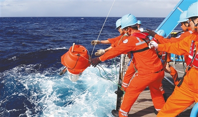 12月3日,考察队员在“沈括”号上布放4500米级大深度剖面浮标。