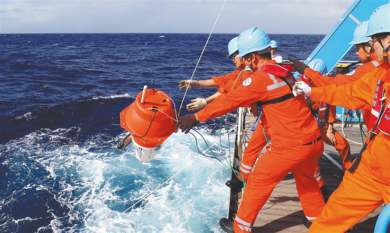 中国多家机构联合组成的“彩虹鱼”2018马里亚纳海沟海试与科考团队已抵达西太平洋第一个深海站位,12月4日成功进行基于我国北斗卫星通信系统的4500米级大深度剖面浮标海试。 新华社记者 张建松 摄