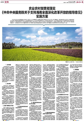 农业农村部贯彻落实《中共中央国务院关于支持海南全面深化改革开放的指导意见》实施方案