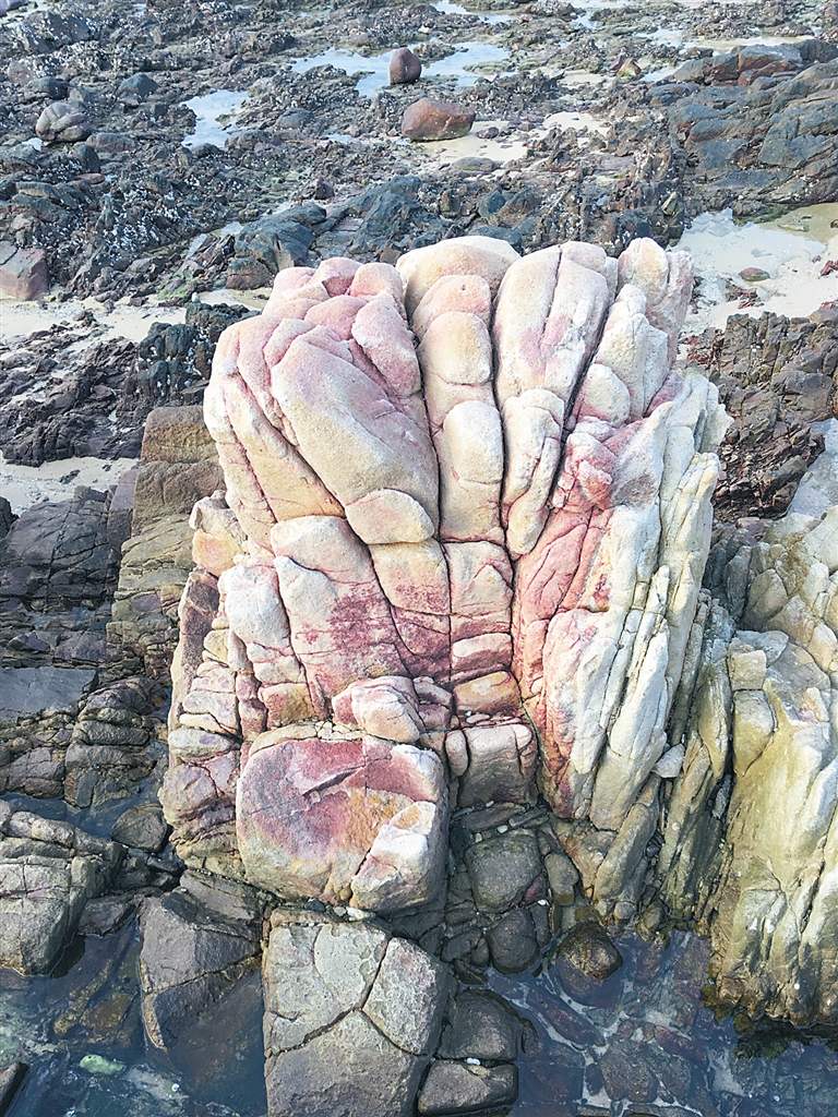 晚霞与海边的礁石、滩涂相呼应,景色之美,令人陶醉。我特别喜欢拍海边细节感的景物:椰子树、枯树、红如花瓣的石块、礁石镶嵌的贝壳与水的呼应。第二天上午,前去棋子湾大角,我同样爱拍不一样的细节:枯枝、仙人掌与礁石、沙滩上的黑色树根与海水对应、弯曲的细沙与黑石块、如刀削一样的岩石……有了这些细节的凸显,风景便多了丰富的立体感。