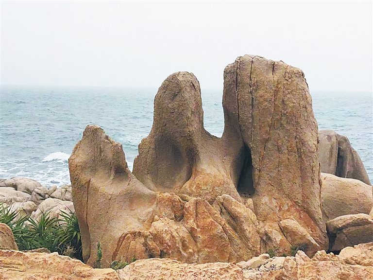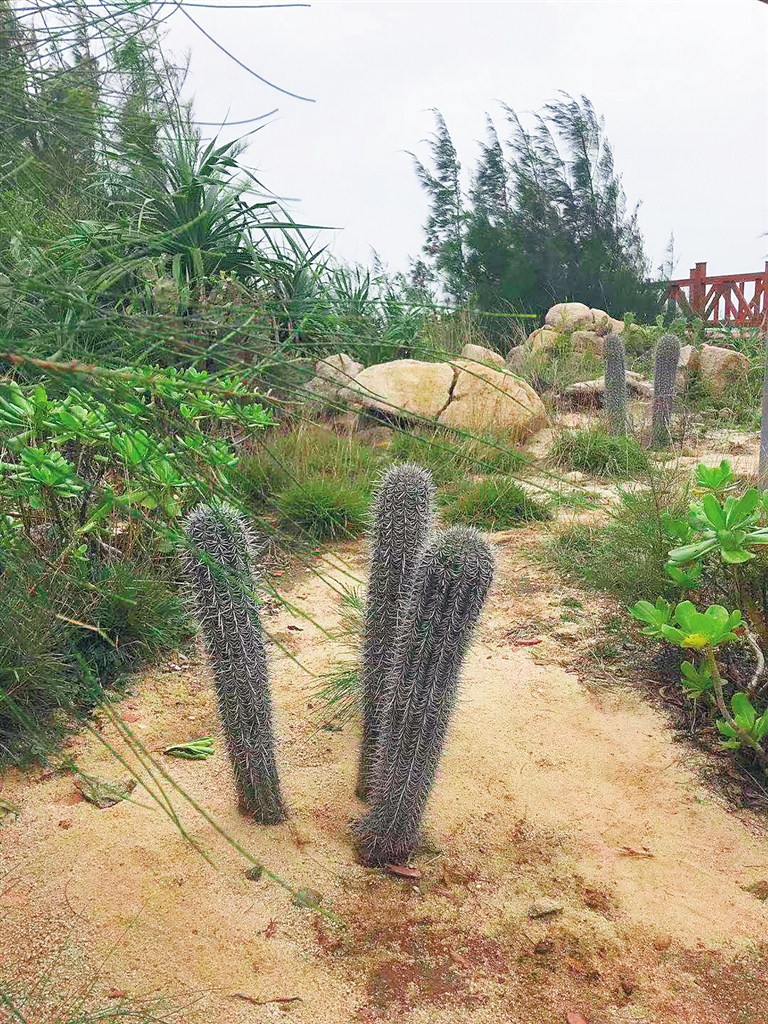 大角湾沿着海岸线新建了海边观景的木栈道,一路上可赏礁石、岸滩,也可观察到仙人掌、红树林与海岸帆船石、笔架山等礁石景观,海岸奇石林立,形状各异,野菠萝与仙人掌在风中野趣横生,丰富多变的海岸景观让游客赞叹不已。