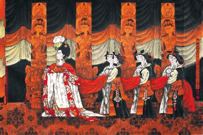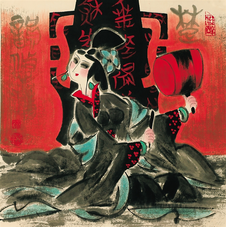 “艳”对应着“京剧风采”“飞天凌空敦煌舞”系列作品。古代人物画作为我国国画的一类,是以古代人物的形貌特点,对中国古代人物做出的一种描述。战国楚墓出土的《人物龙凤》与《人物驭龙》帛画是已知最早的独幅人物画作品。到了汉代,人物画发展已经基本成熟。在人物画的创作上,不仅有造型准的画像,还有以形传神和夸张、变形的作品。许多画像都具有鲜明的写意性。易至群的《京剧泰斗梅兰芳》《泼彩敦煌伎乐舞》等作品充满了灵动性。