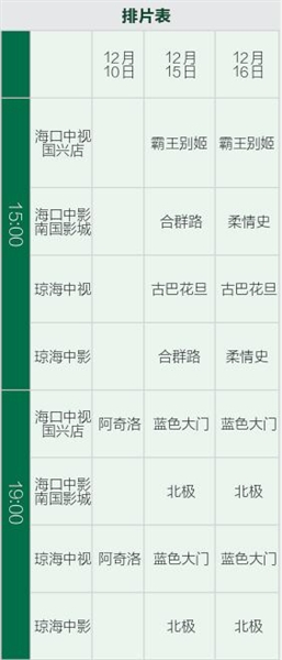 据悉,这七部影片包括《阿奇洛》《霸王别姬》《合群路》《古巴花旦》《蓝色大门》《北极》《柔情史》。这些影片将在12月10日、12月15日、12月16日分别在海口中视国兴店、海口中影南国影城、琼海中视、琼海中影4家影院集中展映。公众可前往影院售票处或通过登录“淘票票”APP购票观看。