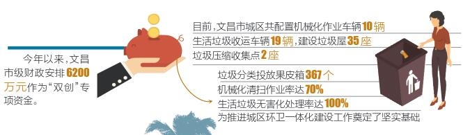 为强力推进“门前三包”责任制、生活垃圾处理、户外广告设置等管理规定,文昌全市配备了282名城市管理人员、2802名村庄保洁员,实现村庄和社区网格化管理全覆盖;城区机械化清扫作业率达70%,全市17个镇均已建设生活垃圾转运站,城区和行政村生活垃圾处理率均达到100%。