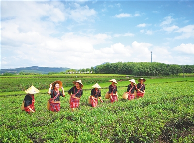 近日,海南农垦白沙茶业股份有限公司开采春茶,首日采摘茶青2万斤,制作成品茶4000斤。图为春茶开采现场,一名采茶的女职工欢快地唱起了歌。