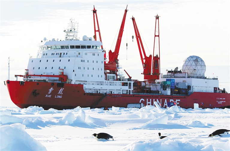 连日来,中国第35次南极科考队搭乘的“雪龙”号极地考察船停靠在南极中山站固定冰外缘海域,距离中山站44公里处卸运物资。一群帝企鹅和阿德利企鹅“陪伴”左右,对“雪龙”号充满好奇。 新华社记者 刘诗平 摄